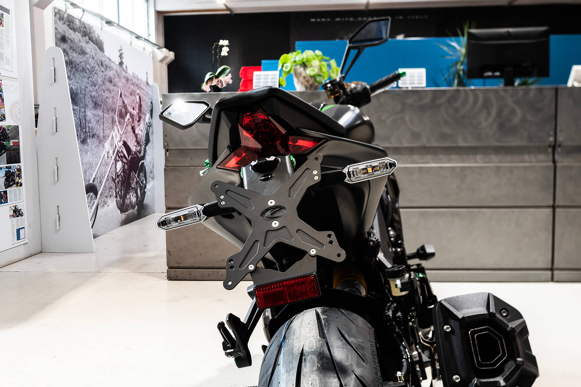 Portamatrículas: Seamos honestos, el soporte de serie es... digamos que "mejorable". Nuestro porta compacto limpia la parte trasera, dejando a la vista ese neumático trasero.